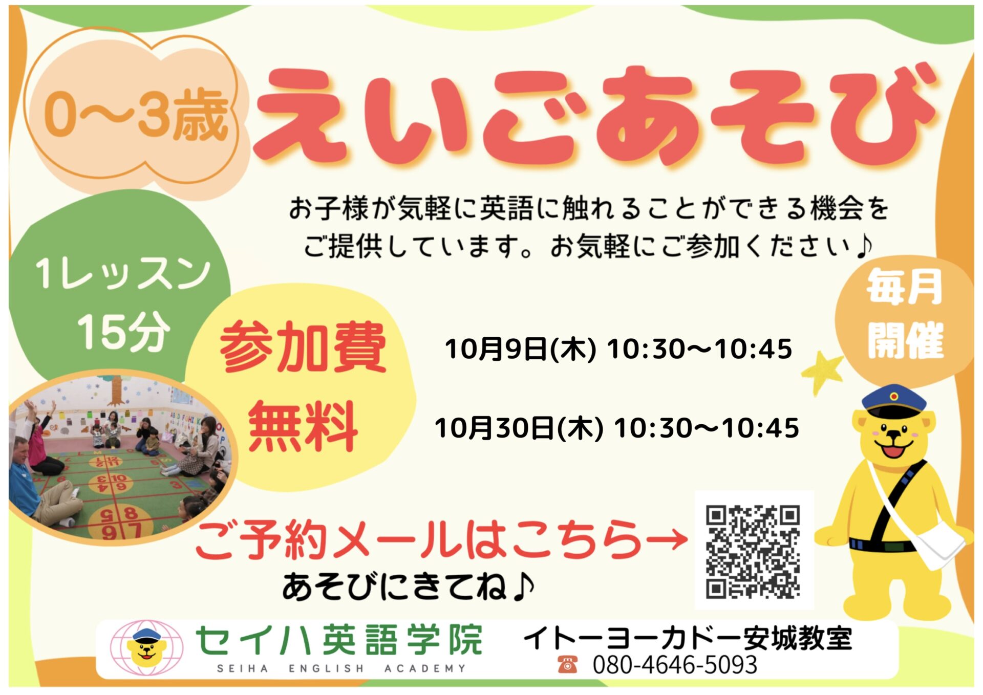 こんにちは♪朝晩はすっかり涼しさを感じるようになり、秋が訪れましたね。過ごしやすい季節をぜひ満喫したいです!英語あそびは、お散歩やお買い物がてら、教室や広場で安全にご参加いただけます♪ぜひ歌やゲームを織り交ぜながら 、ハロウィンに関する単語やアルファベット、数字に触れて楽しみませんか?15分だけなのでお気軽にご参加いただけ、外国人講師ともふれあえます☆ぜひお立ち寄りください♪講師一同お待ちしております(^^)