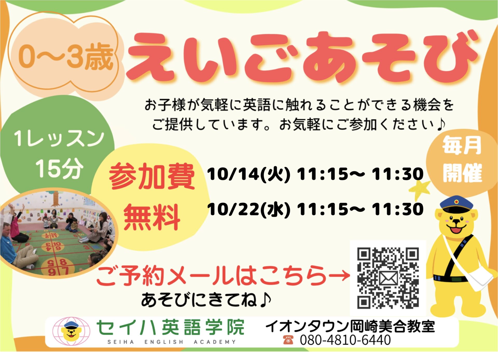 こんにちは♪朝晩はすっかり涼しさを感じるようになり、秋が訪れましたね。過ごしやすい季節をぜひ満喫したいです!英語あそびは、お散歩やお買い物がてら、教室や広場で安全にご参加いただけます♪ぜひ歌やゲームを織り交ぜながら 、ハロウィンに関する単語やアルファベット、数字に触れて楽しみませんか?15分だけなのでお気軽にご参加いただけ、外国人講師ともふれあえます☆ぜひお立ち寄りください♪講師一同お待ちしております(^^)
