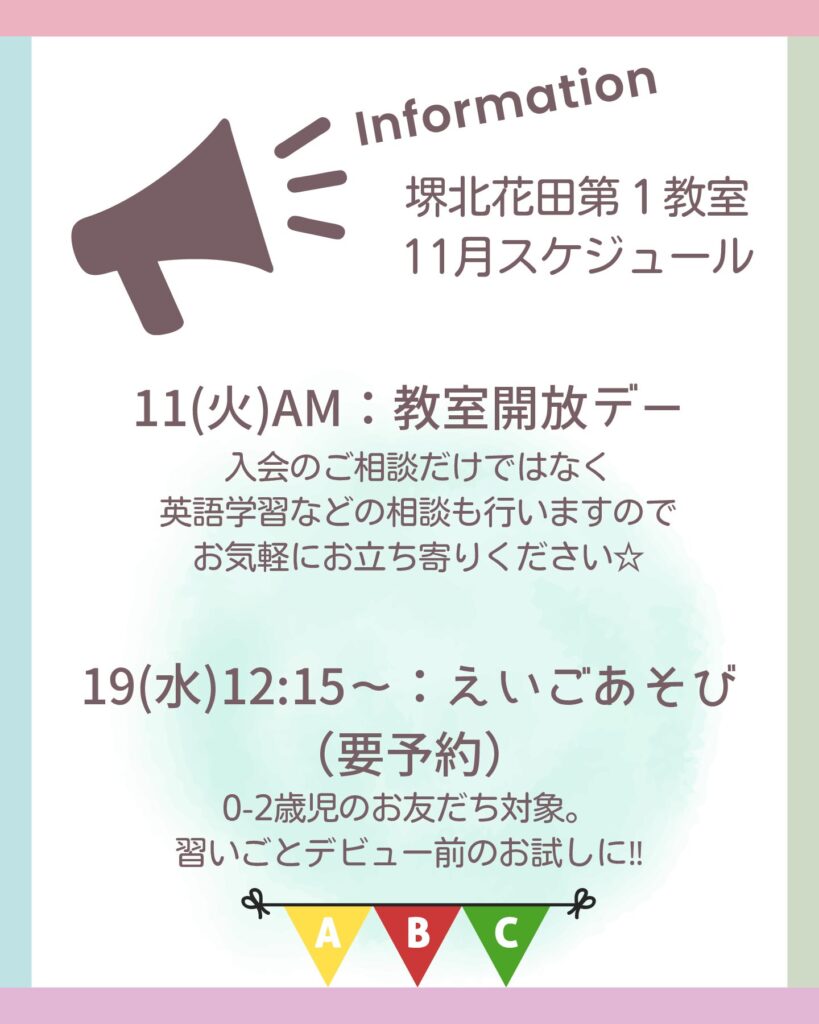 ハロー🤗セイハ英語学院イオンモール堺北花田第1教室です😊11月の教室スケジュールお知らせいたします📝🍁11月11日㈫教室開放デー🍁この日は教室を開放しております🪟教室ご見学、ご質問承りますのでお気軽にお越しくださいませ💁🍁11月19日㈬12時15分~えいごあそび🍁11月のトピックは🦁動物園にいる動物達🦁です😊対象年齢は0歳~3歳👶親子でご参加いただけます☺️参加費は無料🆓皆さまのご参加お待ちしておりまーす🥰